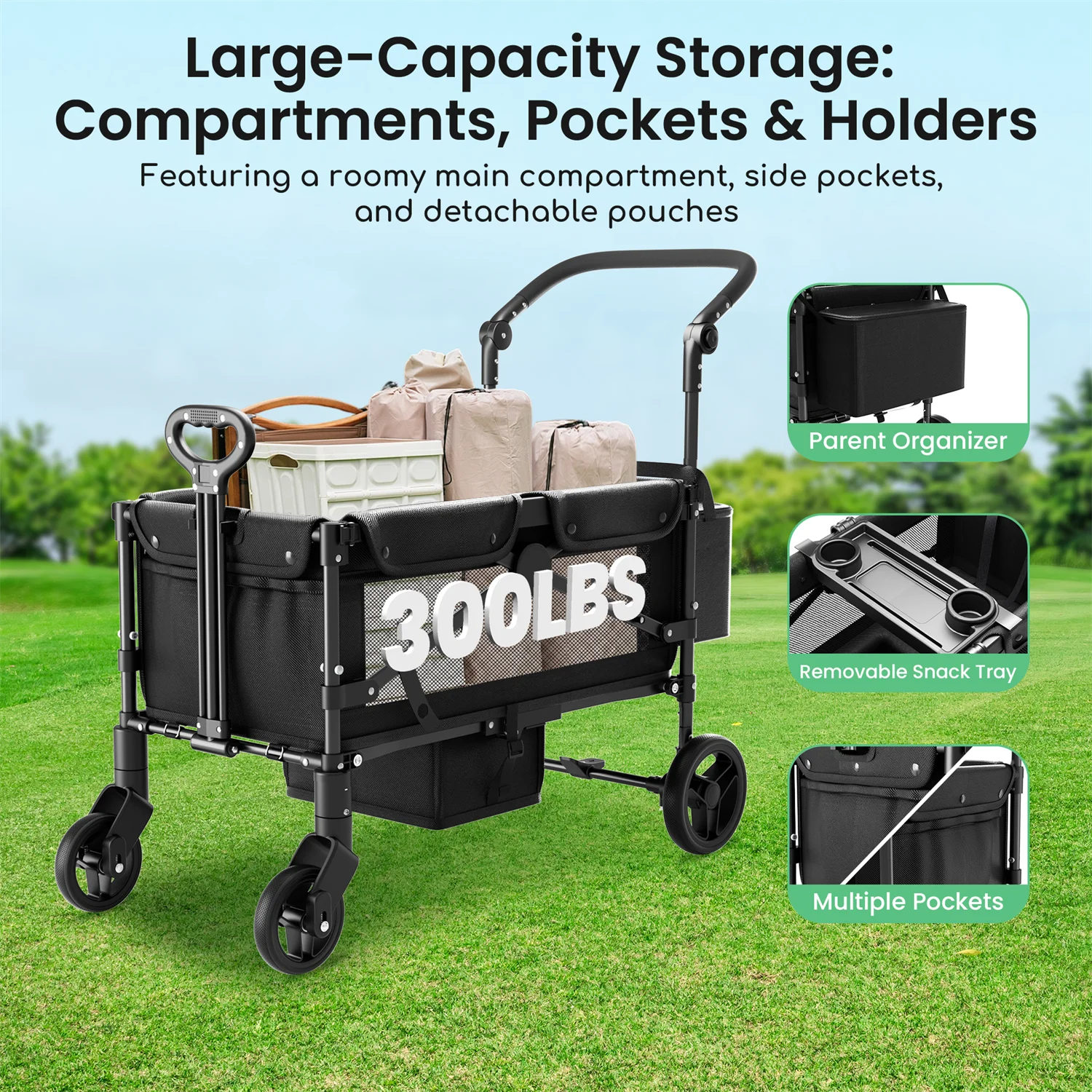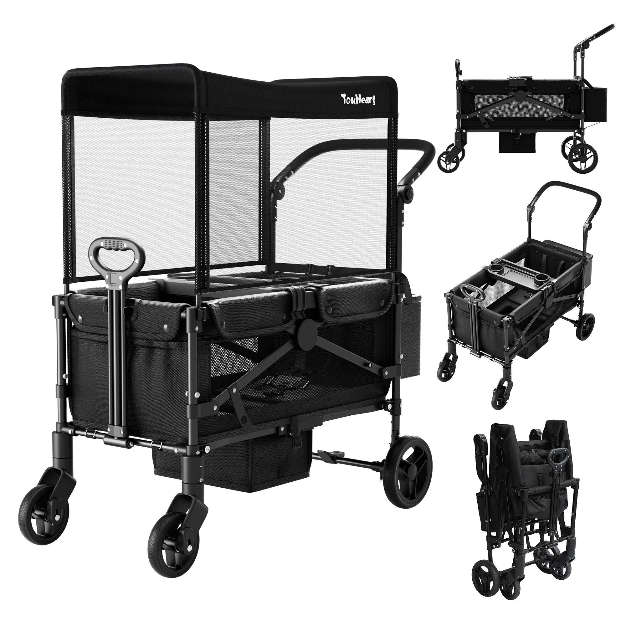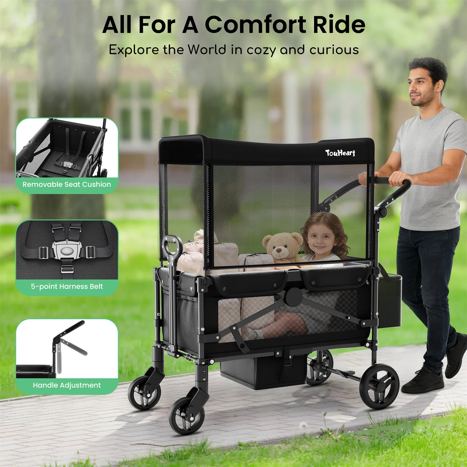 The foldable design allows for quick setup and compact storage, while the sturdy frame ensures stability and smooth maneuverability. A removable canopy provides shade and sun protection when needed, and can be easily detached for open-air rides. Whether strolling through the park, shopping, or traveling, this multifunction wagon adapts to your daily needs.