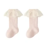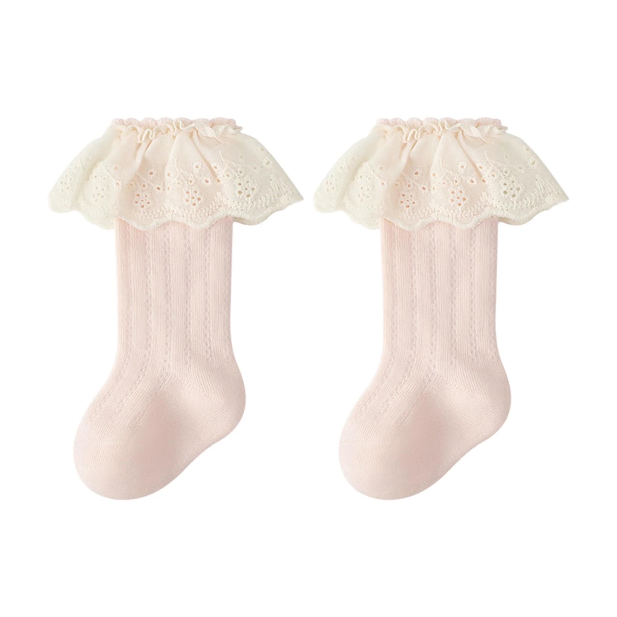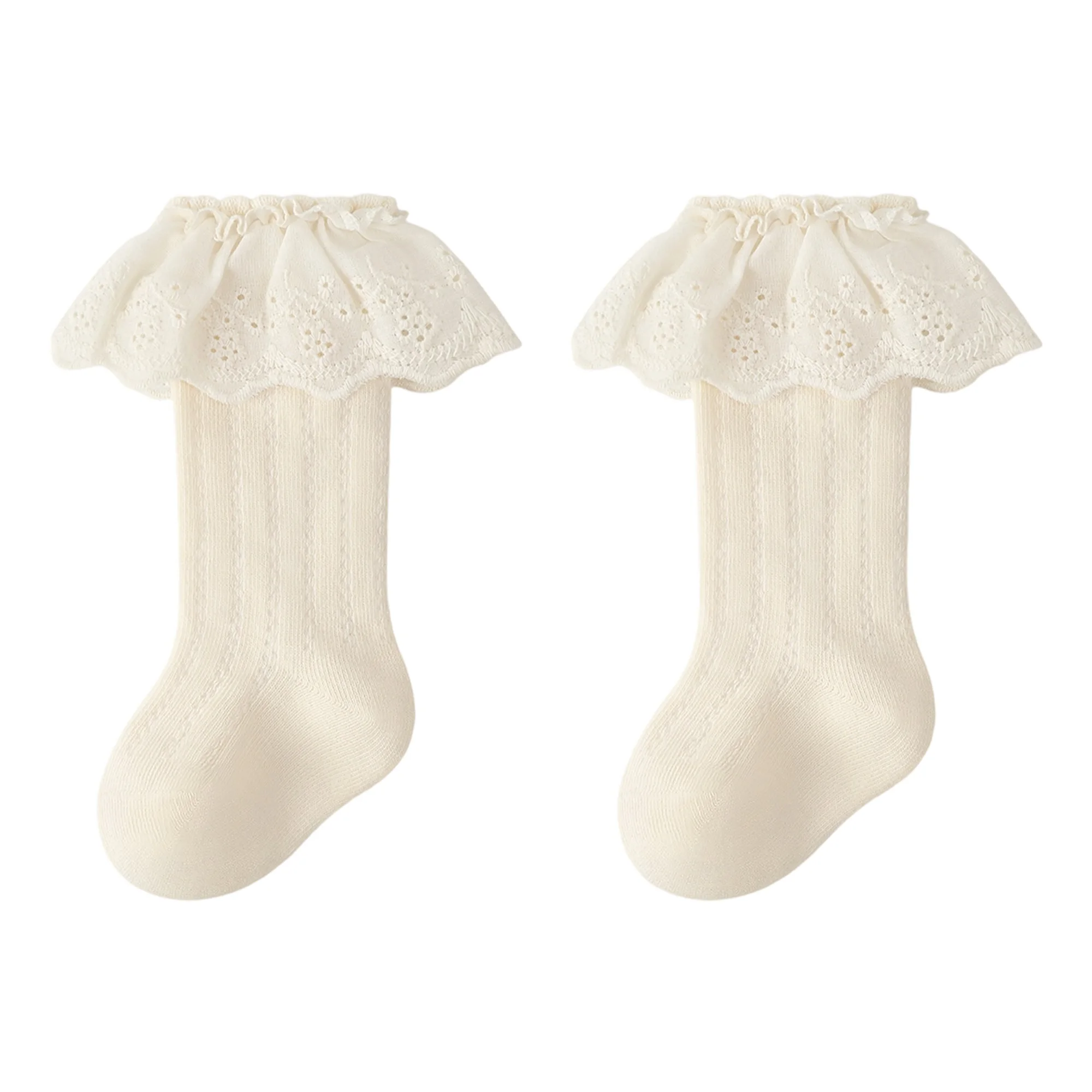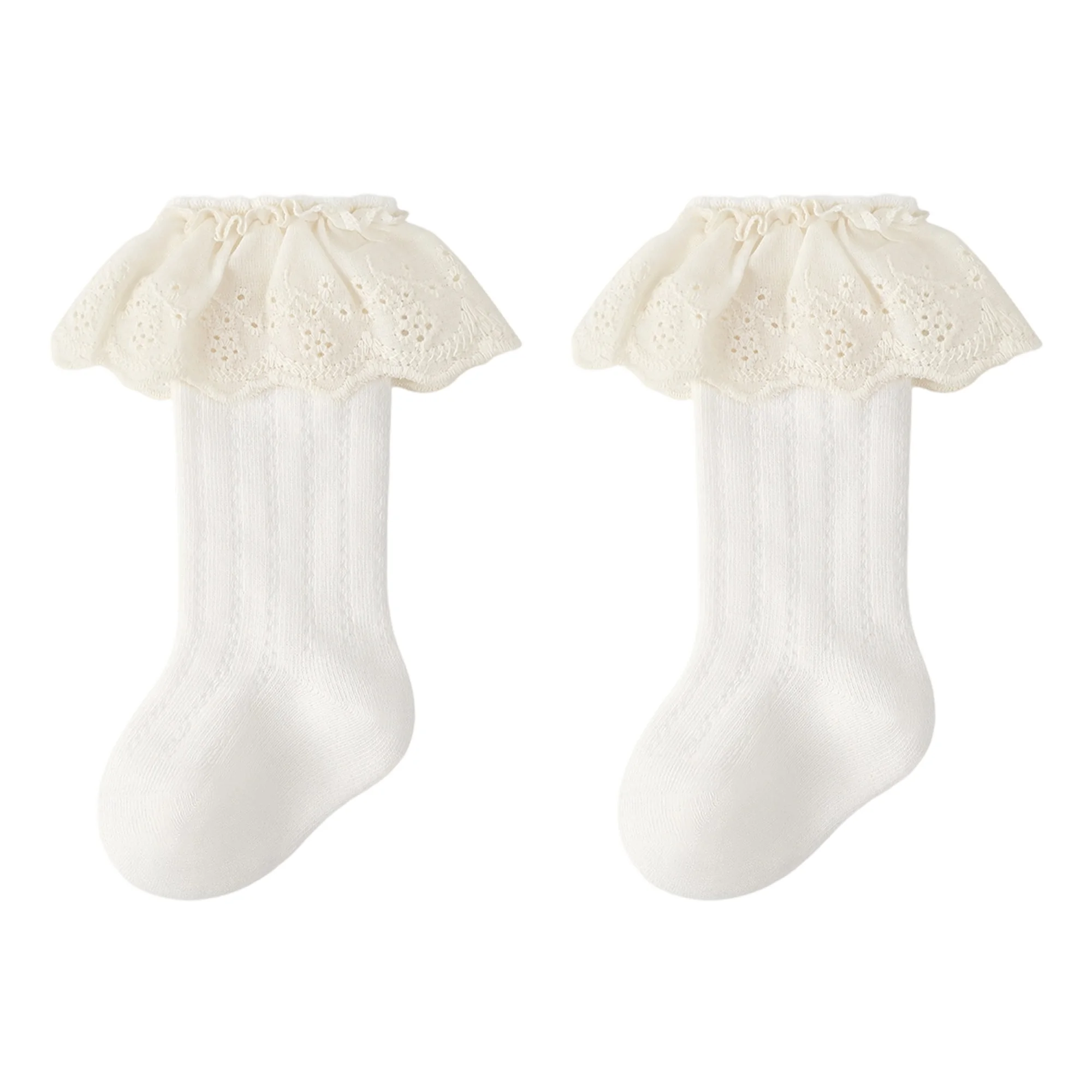 Featuring delicate lace trim detailing, these knee-high socks add a sweet, elegant touch that pairs beautifully with dresses, rompers, skirts, and special occasion outfits. Cotton-blend lace knee socks like these are commonly made for softness/stretch and styled to sit just below the knee for a classic look.