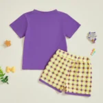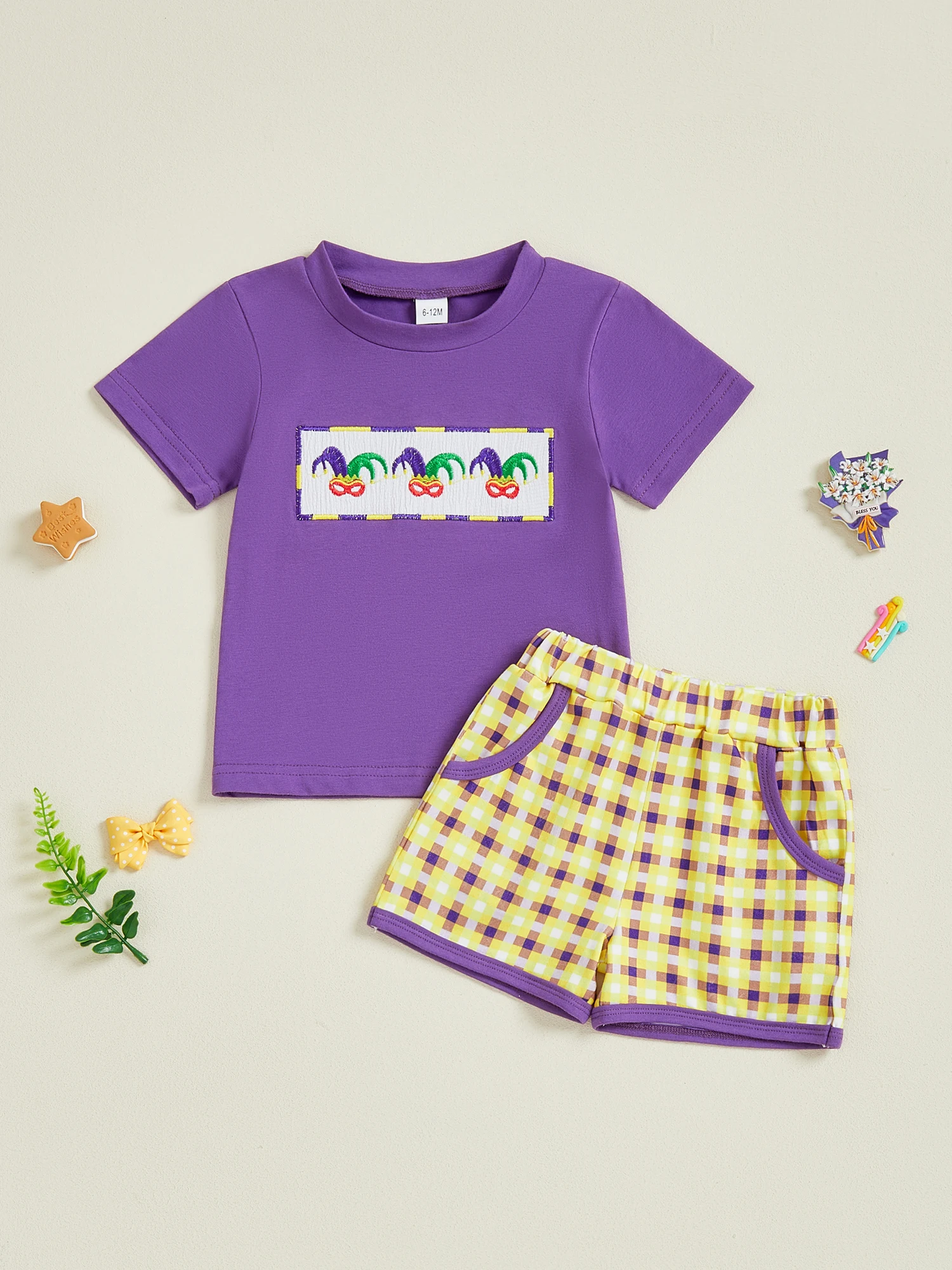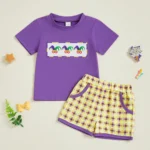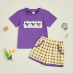 The crisp embroidered shirt features festive detailing that adds a refined touch, while the coordinated plaid shorts bring vibrant springtime colors and playful flair. Together, they create an adorable outfit that’s both stylish and comfortable for boys.
