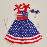 Featuring a bold American flag design, sweet ruffle sleeveless details, and a matching headband, this coordinated set combines festive charm with all-day comfort. Patriotic girls’ dress sets like this are popular for holiday events and summer celebrations thanks to their lightweight, breathable styling. (walmart.com)