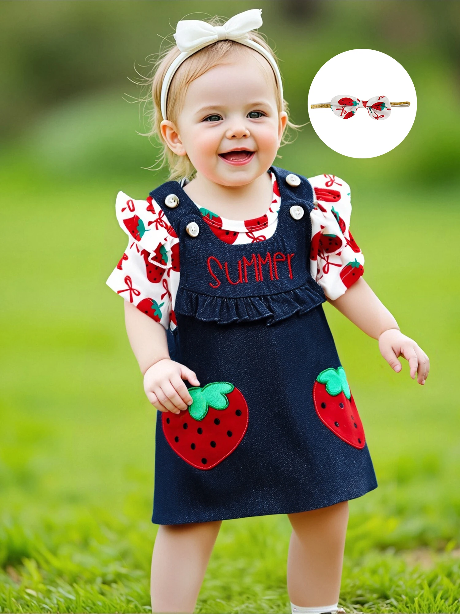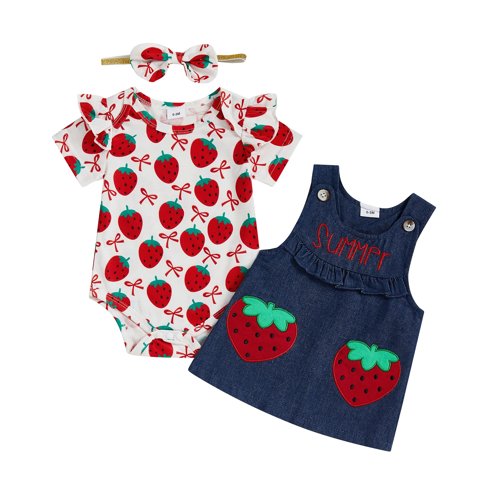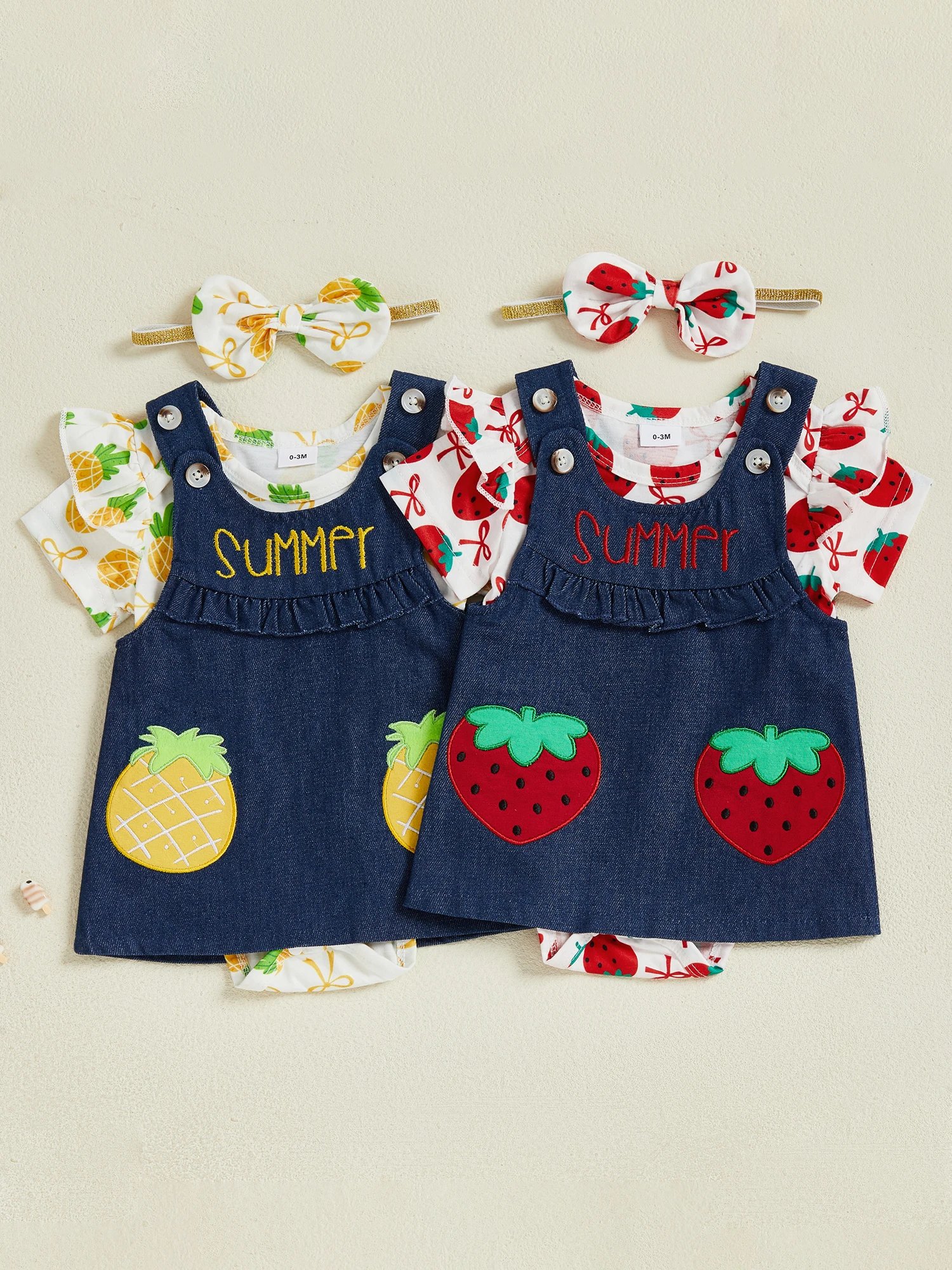 Featuring a fun watermelon print sleeveless romper, a stylish ruffle trim denim overall dress, and a coordinating matching headband, this complete 3-piece set creates an effortlessly cute layered look inspired by popular summer baby outfit styles.